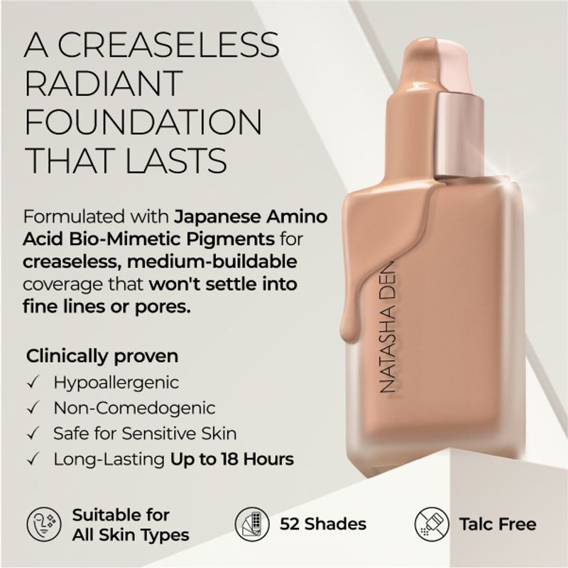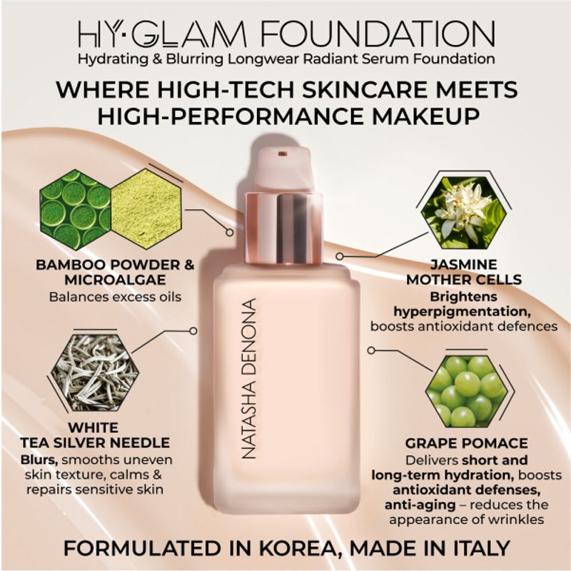 Una base híbrida tipo sérum de cobertura media modulable que minimiza la apariencia de poros y líneas finas mientras unifica visiblemente el tono de la piel, dejando un acabado luminoso y natural hasta por 18 horas. Está formulada con microalgas, polvo de bambú, células madre de jazmín y orujo de uva, que aportan hidratación, ayudan a controlar el exceso de oleosidad, suavizan la textura y estimulan la producción de colágeno. Su textura ligera se desliza fácilmente sobre la piel, creando un efecto blur con sensación de segunda piel. No se cuartea ni se derrite, y ofrece un resultado uniforme y confortable durante todo el día. Disponible en una amplia variedad de tonos, cada uno diseñado para combinar perfectamente con el corrector HY-GLAM. Apta para todo tipo de piel.