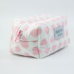 Cosmetiquera de tela blanca con corazones rosados y un zipper super cómodo, perfecta para las Girls! Utilízala para tus productos de maquillaje o piel para llevar en tu cartera de forma organizada y eficiente!