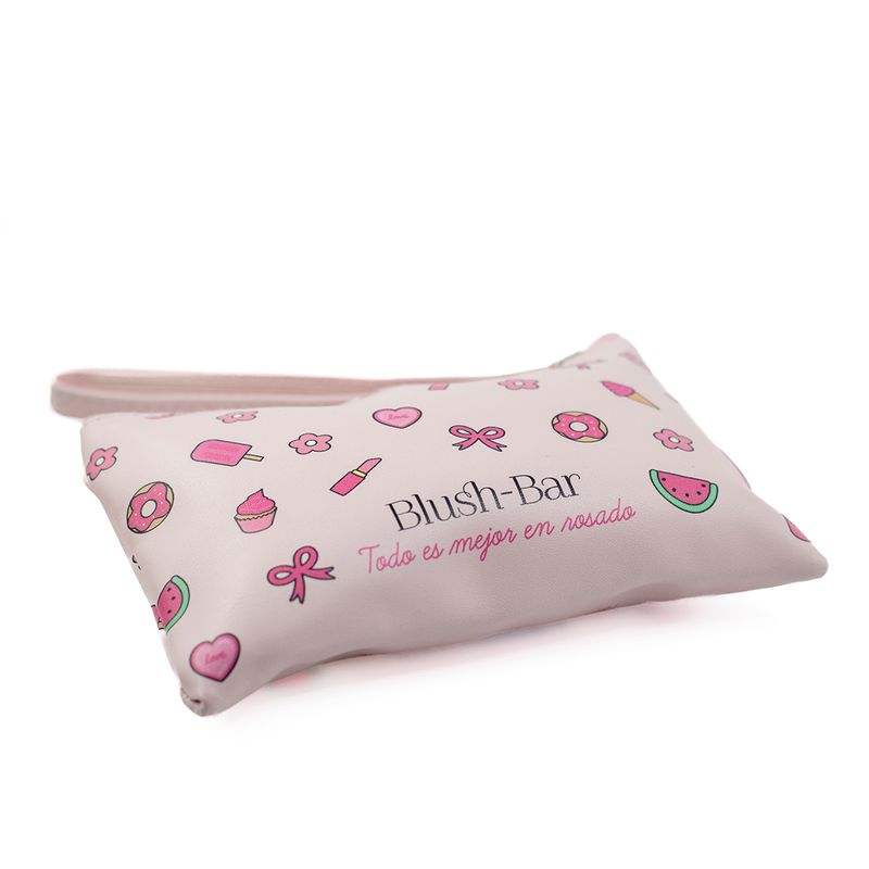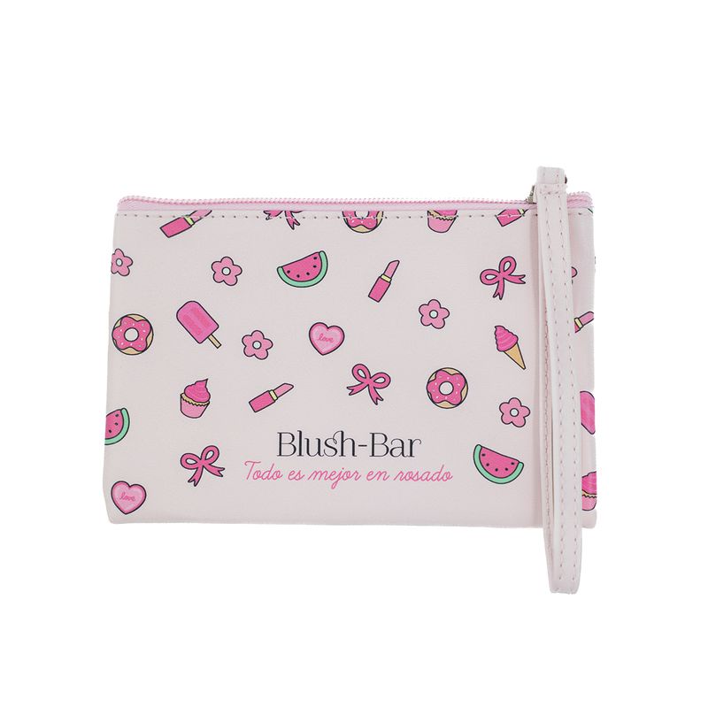Cosmetiquera pequeña y ligera con diseño de Todo Es Mejor en Rosado Blush-Bar. Estas son las cosas rosadas que más nos encantan: una paleta, un lazo rosado, un corazón, una dona, una deliciosa sandía! Tiene una manija para que sea fácil de encontrar y también te puede caber tu celular! Tu y tu bestie la amarán!