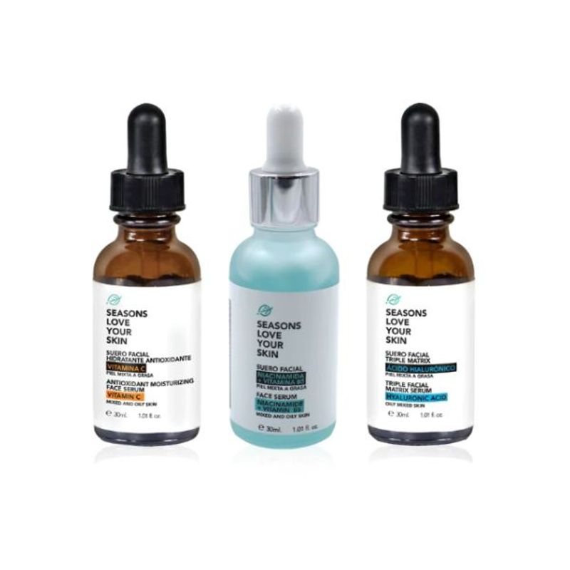 Un Kit con tres poderosos sueros para una rutina facial completa. Incluye Vitamina C + Triple Matrix Ácido Hialurónico + Niacinamida