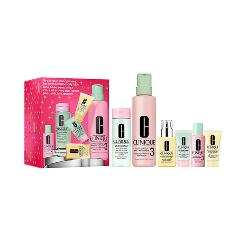Un kit edición limitada de cuidado de la piel los productos esenciales de Clinique para conseguir una piel visiblemente más radiante, ahora en un práctico set doble: uno para casa y otro ideal para llevar de viaje. Con una fórmula personalizada especialmente para pieles grasas, ayudando a limpiar, exfoliar y equilibrar el exceso de grasa para una piel más fresca, suave y luminosa estés donde estés.